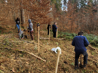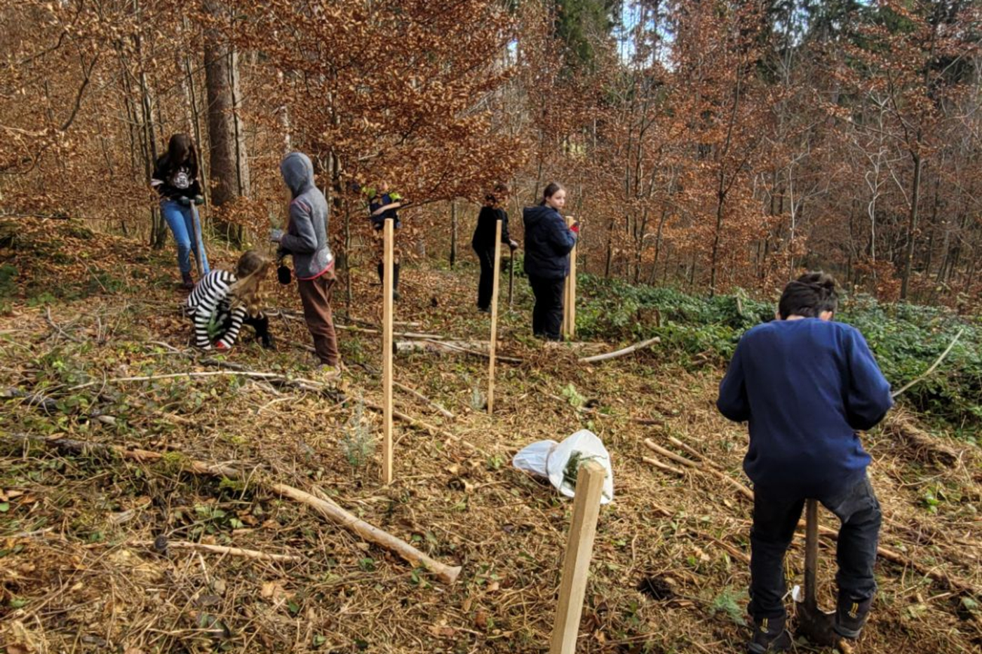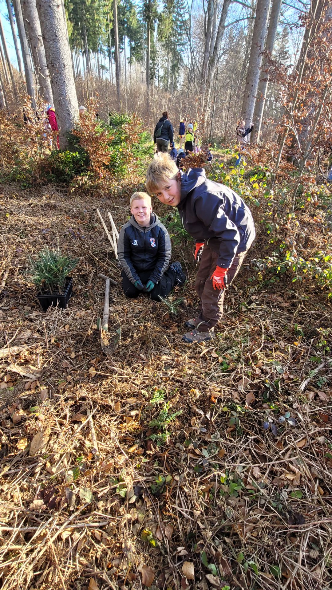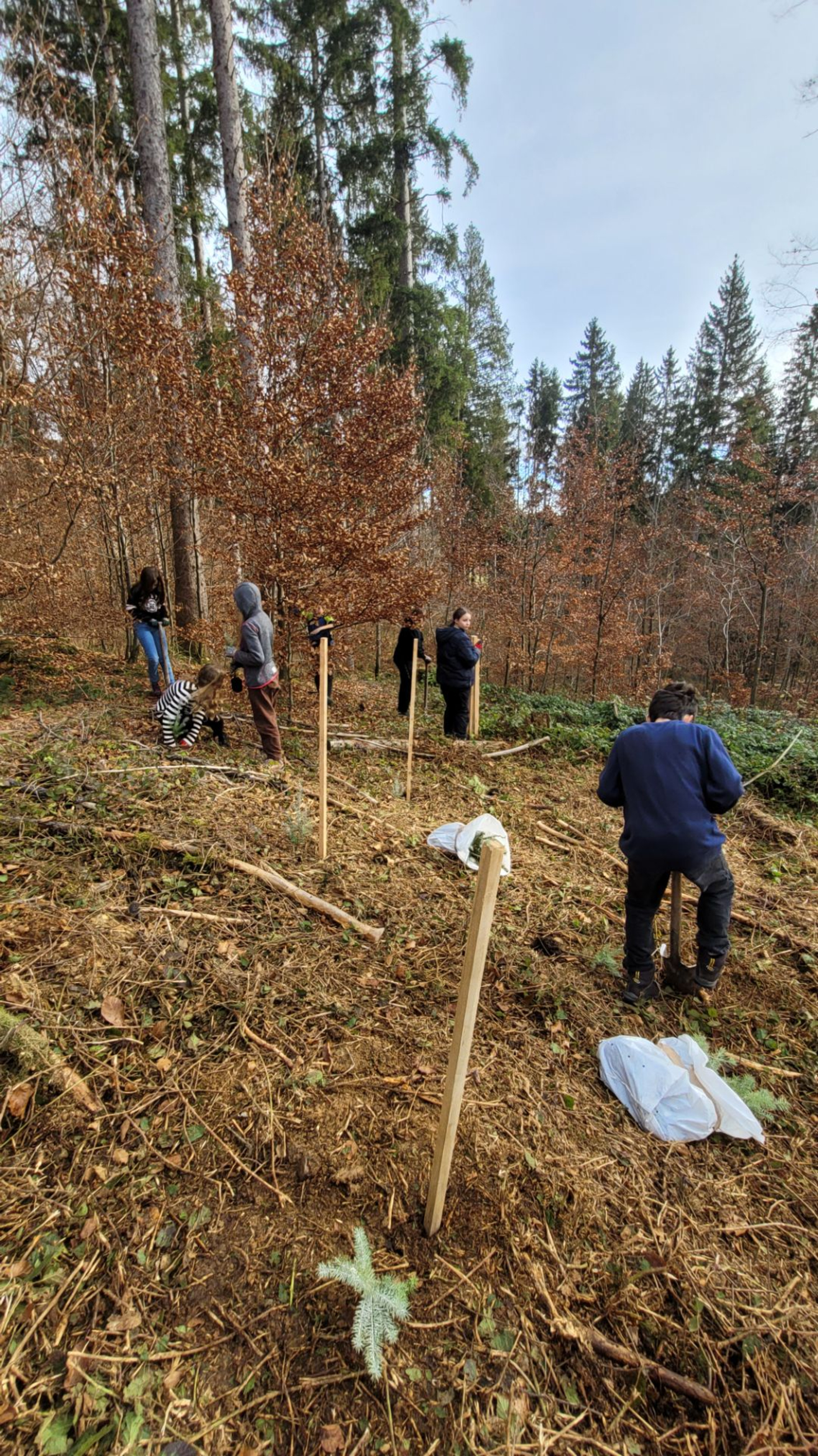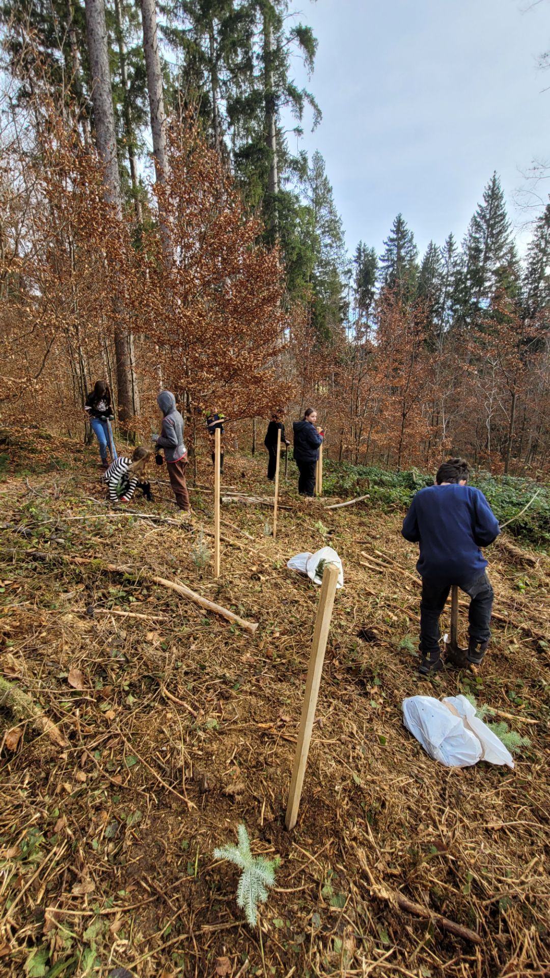 Aufgeteilt in kleine Teams gruben die Schülerinnen und Schüler Pflanzlöcher, setzten die kleinen Bäume vorsichtig ein und traten die Erde fest. Die Begeisterung war groß, und am Ende konnten alle stolz auf eine beeindruckende Fläche frisch gepflanzter Bäume blicken.