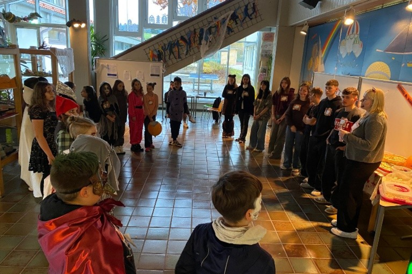 Am 30. 10. 2025 luden die Tutoren die Schüler der 5. Klassen zu einer Halloween-Party ein, bei der die Kinder Karaoke singen, Indiaca spielen, ihre eigenen Waffeln designen und viele lustige Halloween-Spiele spielen konnten. Für die Verpflegung war durch ein schaurig-schönes Buffet gesorgt. Der Höhepunkt des Abends war ein Kostümwettbewerb, bei dem die Kinder sich und ihre Kostüme vorstellen mussten und im Anschluss alle für ein Kostüm abstimmen durften. Ein schaurig-schöner Abschluss der Einstiegszeit in den neuen Schulalltag.